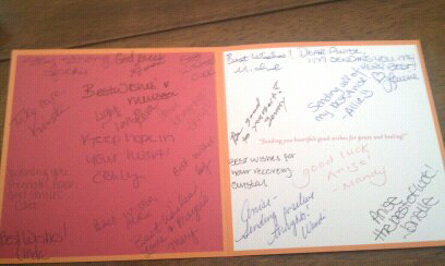 When my mom was diagnosed I scoured the internet for information and resources. One of the things I found was a website www.franceluxe.com. They sell beautiful scarves and hair accessories and they provide women and children losing hair due to illness with a free scarf. They sent my mom one a year ago, and today I received mine. It's a beautiful silk pink peacock print. The also send a get well card hand signed by everyone in their office.